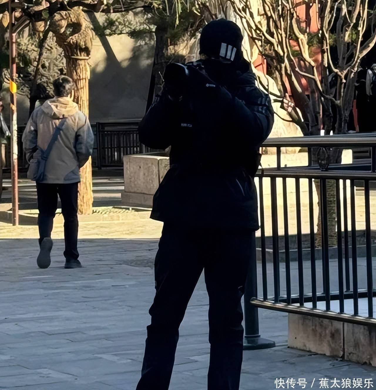 有意思的是,他那天明显不是为了“被看见”。全身黑色不是为了造型,而是纯粹为了保暖。帽子压得很低,走路姿态也放松到不行,偶尔低头看手机,偶尔停下来发会儿呆,跟周围晨练、遛鸟的大爷大妈融在同一个生活场景里。可越是这样,越显得真实。